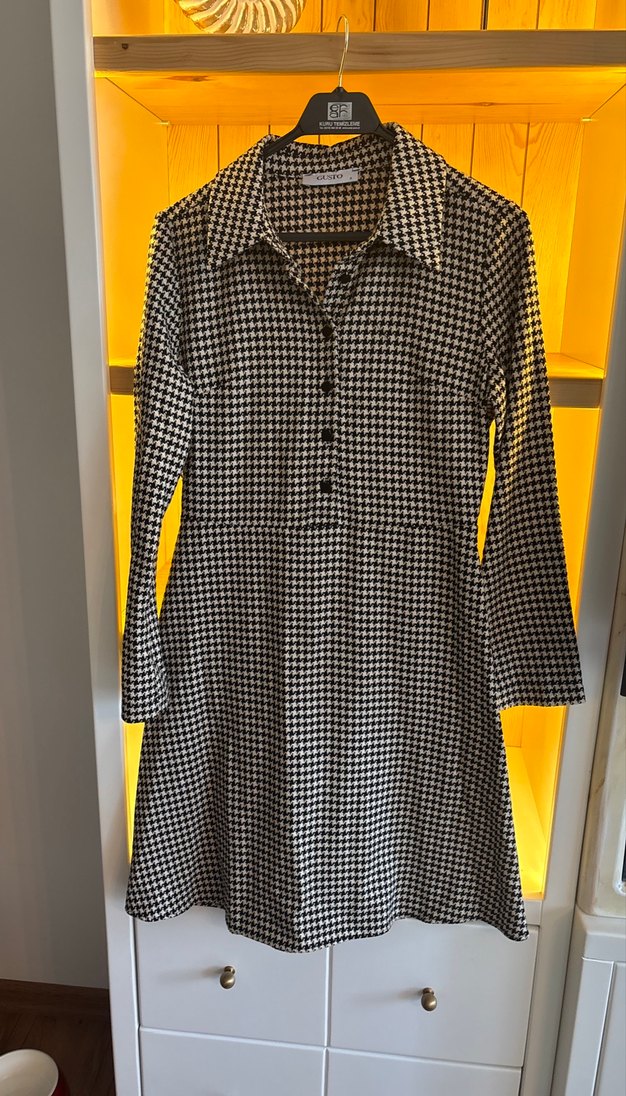 Gri ekose desenli, uzun kollu, düğmeli ve yakalı midi elbise. Sentetik kumaştan, rahat kesim, günlük sokak stiline uygun. Bir kere giyildi.