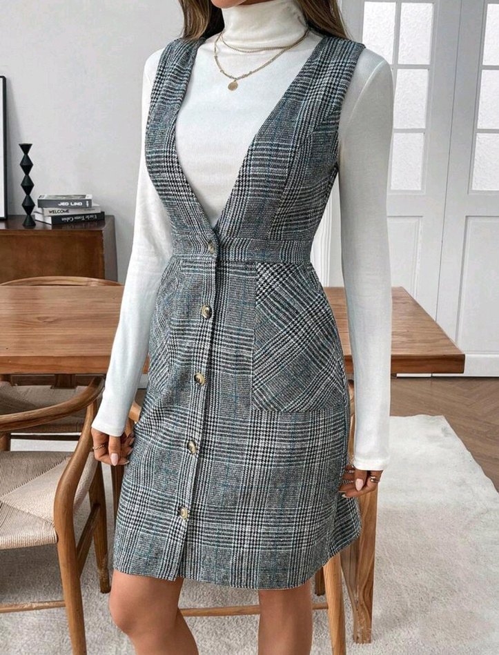 Düğmeli, kolsuz midi elbise, gri ekose desenli ve kesimli yakaya sahip. Normal boy ve regular fit, mevsimlik ve kışlık girilebilecek bir üründür.Bel 40-41 boy 95 iki koltuk altı arası 49 cm