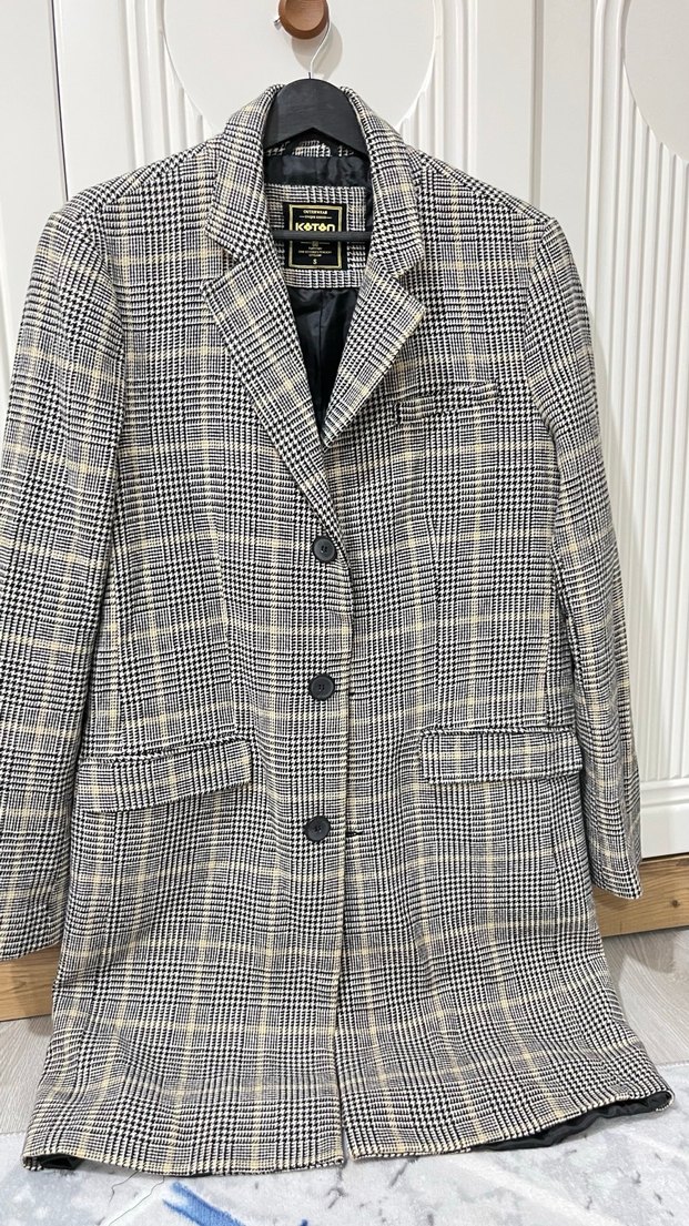 Düğmeli, ekose desenli gri erkek kaban, normal boy midi uzunluğunda, uzun kollu ve regular fit kesimdedir. Sentetik kumaştan üretilmiş, ofis ve günlük kullanım için uygundur.