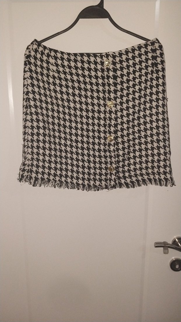 Gri ekose desenli, düğmeli midi etek. Rahat kesimi ve yumuşak sentetik kumaşıyla günlük kullanıma uygundur.