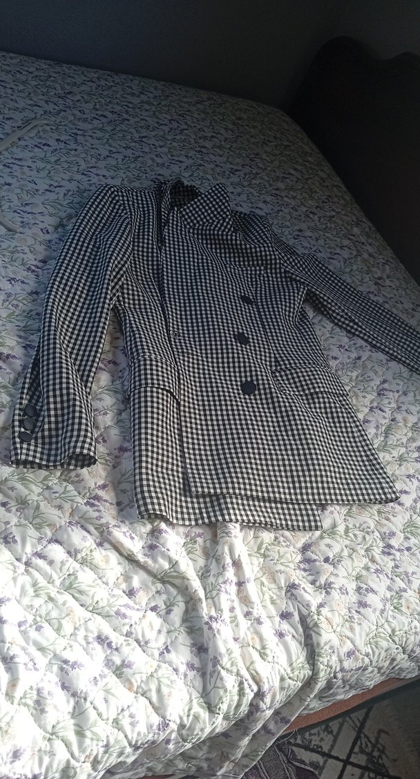 Düğmeli, gri ekose desenli kadın blazer. Uzun kollu, normal boyda, Paris tarzı günlük kullanıma uygun midi kesim.