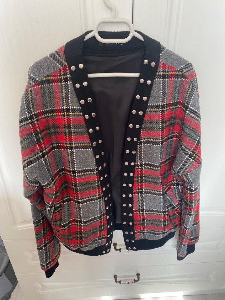 Gri ekose desenli, düğmeli, uzun kollu, notched lapel yakalı, sentetik kumaştan midi uzunlukta bol kesim kadın ceketi. Günlük kullanıma uygun, grunge punk tarzında.