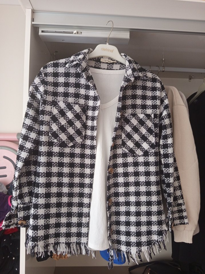 Düğmeli, uzun kollu, gri ekose desenli midi gömlek. Notlu yaka ve bol kesimiyle gündelik kullanıma uygun, sentetik kumaştan üretilmiştir. Püskül detaylarıyla sokak stiline uygun.