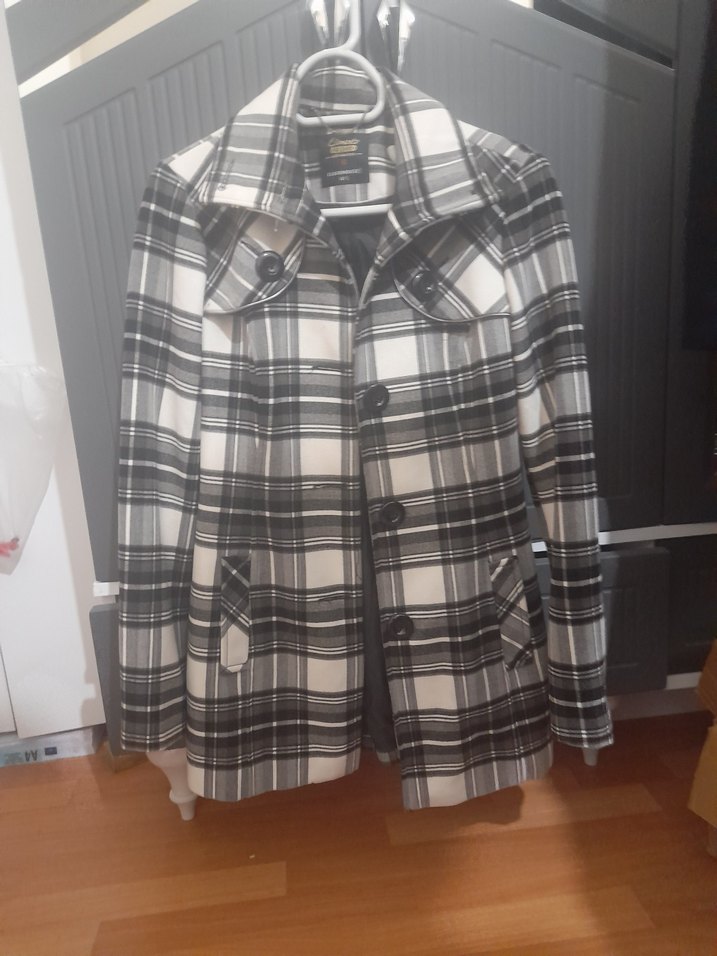 Gri ekose desenli kadın kaban, düğmeli ön, kesilmiş yaka ve uzun kolludur. Regular fit ve midi boyda, günlük ve sokak stiline uygundur.