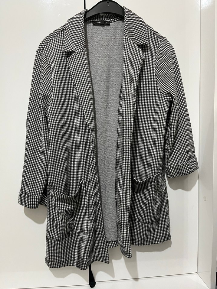 Düğmeli, gri ekose desenli kadın kaban, notched lapel yakaya sahip. Uzun kollu, midi boy, regular fit ve sentetik kumaştan üretilmiştir. Ofis için uygun şık bir model.