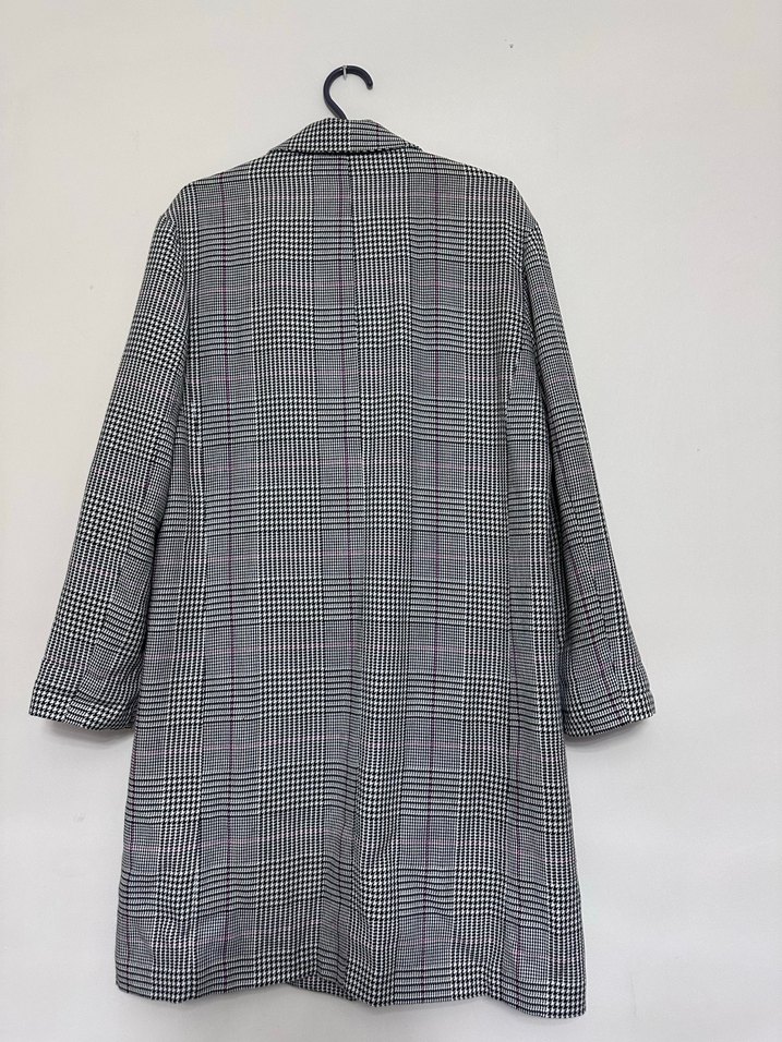 Gri ekose desenli, düğmeli, kruvaze yakalı midi uzunlukta kadın kaban. Uzun kollu, normal kesim ve sentetik kumaştan üretilmiştir. Ofis için uygun ve trend sokak tarzına sahip.