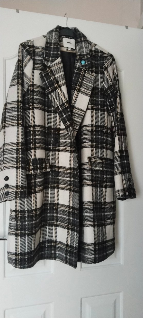 Düğmeli, gri ekose desenli yün kaban, normal boy midi uzunlukta, uzun kollu ve regular fit kesimdedir. Günlük kullanım için uygundur.