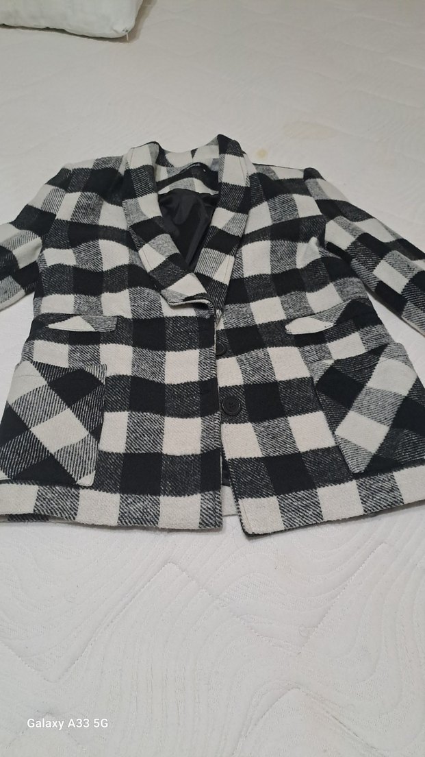 Gri ekose desene sahip bu kaban, düğmeli ve kesimli yaka detaylıdır. Uzun kollu, normal kalıptır ve yumuşak, sıcak kumaştan üretilmiştir.