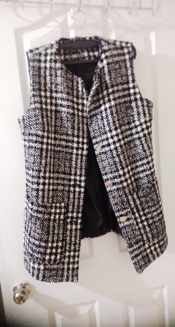 Düğmeli, gri ekose desenli, kolsuz ve normal boy midi kadın yelek. Notlu yakası ve rahat kesimiyle günlük kullanıma uygundur.