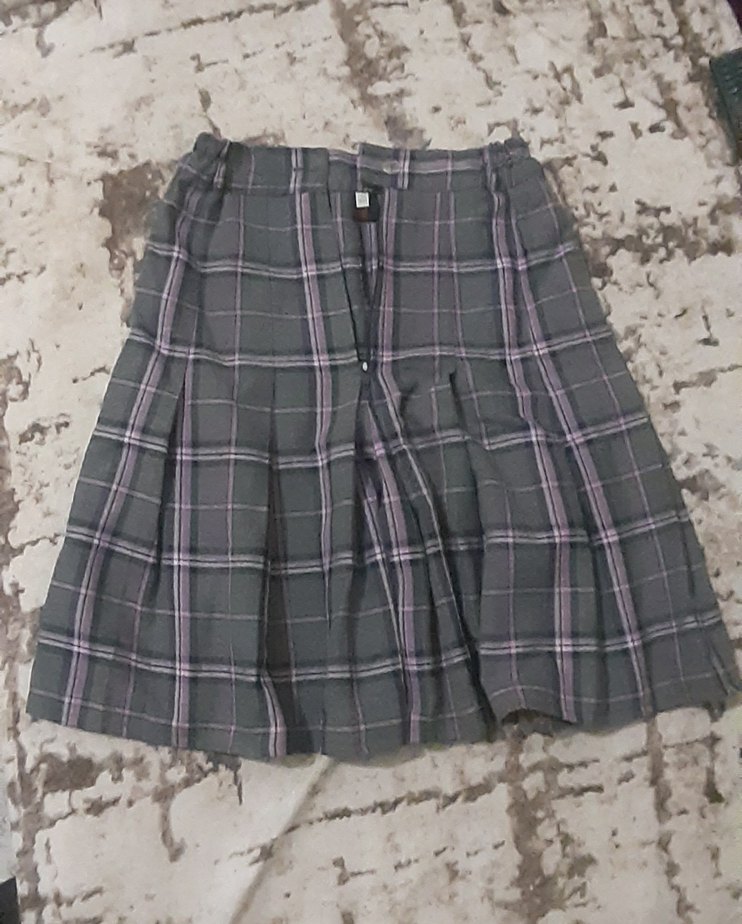 Gri ekose desenli, düğmeli ve bol kesim midi kumaş pantolon. okul forma stili için uygun.