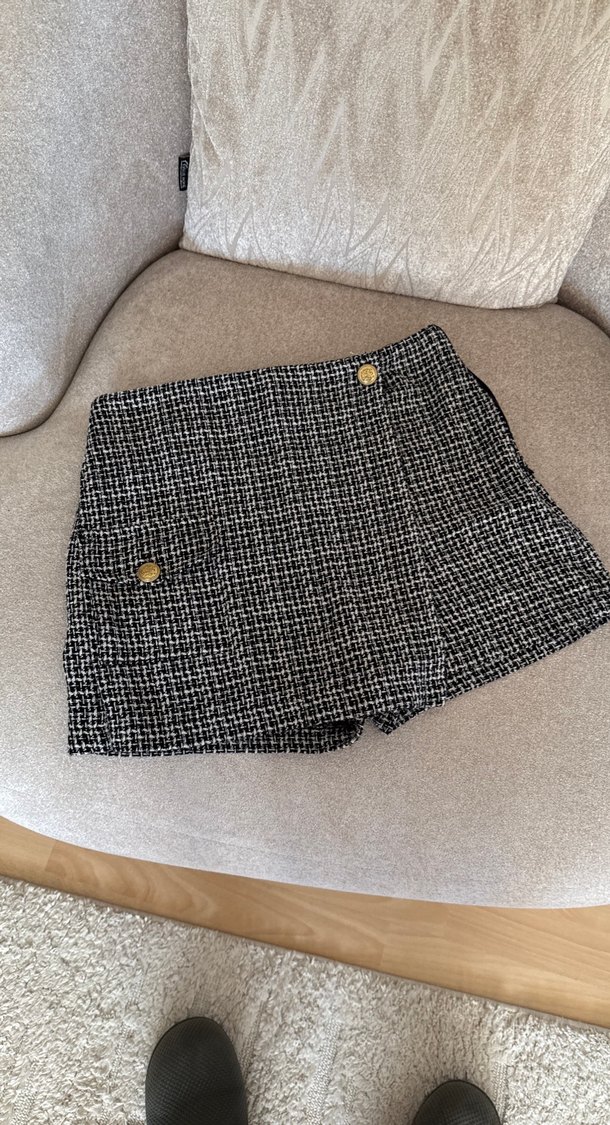 Düğmeli, gri ekose desenli yün kumaştan yapılmış, dar kesim mini etek. Trendy günlük sokak tarzı için uygundur.