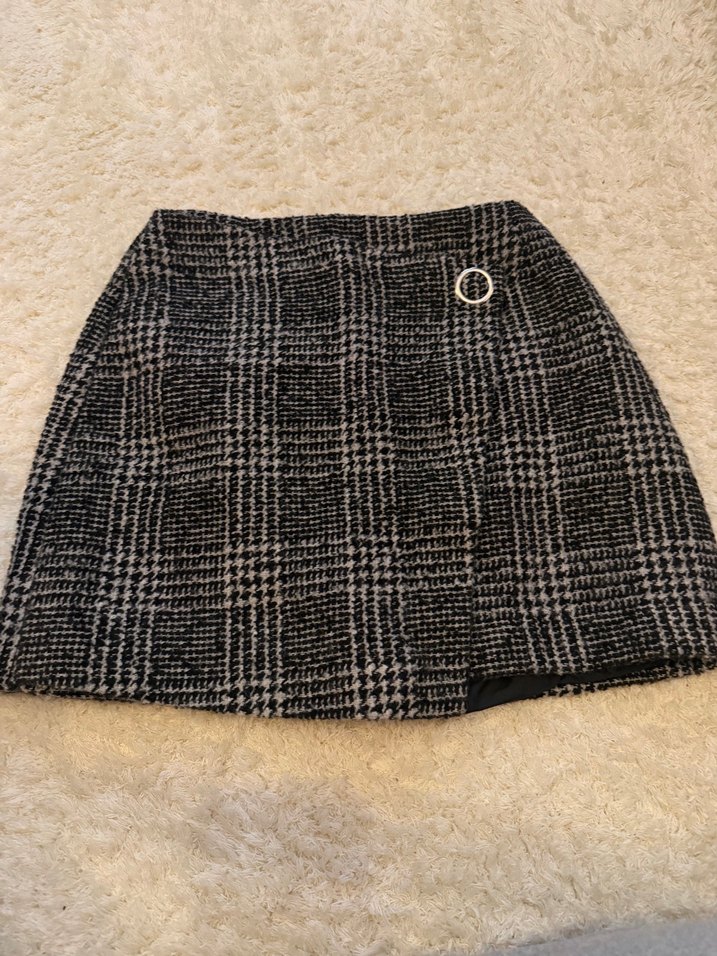 Gri ekose desende, düğmeli ve küçük halka detaylı yün kumaştan, trend ve rahat mini etek.
