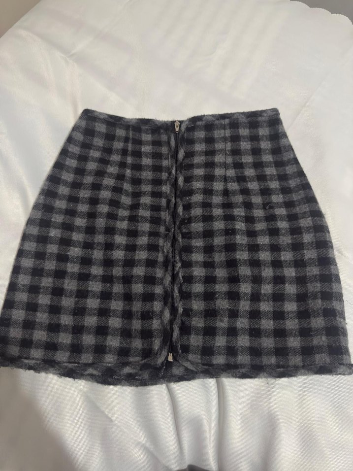 Düğmeli, gri ekose desenli, sentetik kumaştan yapılmış, rahat ve sıkı kesim mini etek.
