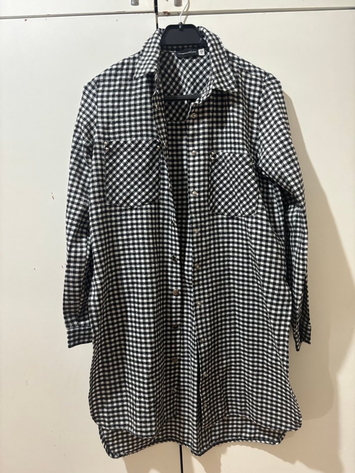 Pamuklu kumaştan, gri ekose desenli, uzun kollu ve düğmeli, notched lapel yakalı bol kesim kadın gömleği. Sokak stiline uygun rahat tasarım.