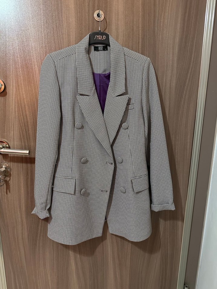 Gri ekoseli, düğmeli, normal boy midi uzunluğunda kadın blazer ceket. Notch yaka ve strappy kolludur. İş ve günlük tarz için uygundur. Sentetik kumaştan üretilmiştir.