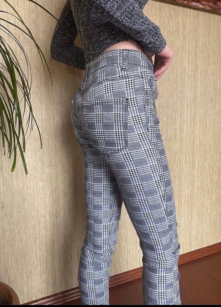 Düğmeli, gri ekoseli, dar kesim kadın kumaş pantolon. Normal midi boyda, sentetik kumaştan, xs ve s beden için uygun sorunsuz alana hayırlı olsun