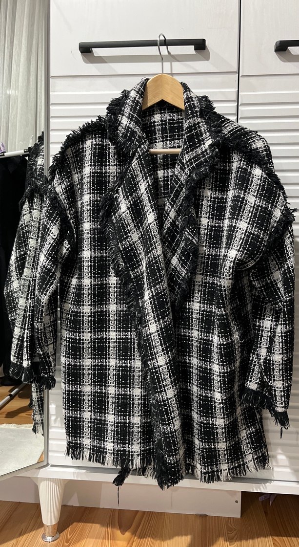 Gri ekoseli düğmesiz uzun kolludur. Notch yakalı, bol kesim ve rahat sokak stili için uygundur. Günlük kullanım için ideal.