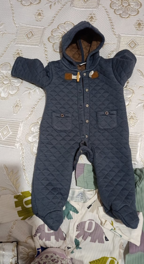 Düğmeli önü ve kapüşonlu, yumuşak ve sıcak kumaştan yapılmış koyu gri erkek bebek tulumu. İki ön cepli, rahat ve sokak tarzı görünümlü. ❄️