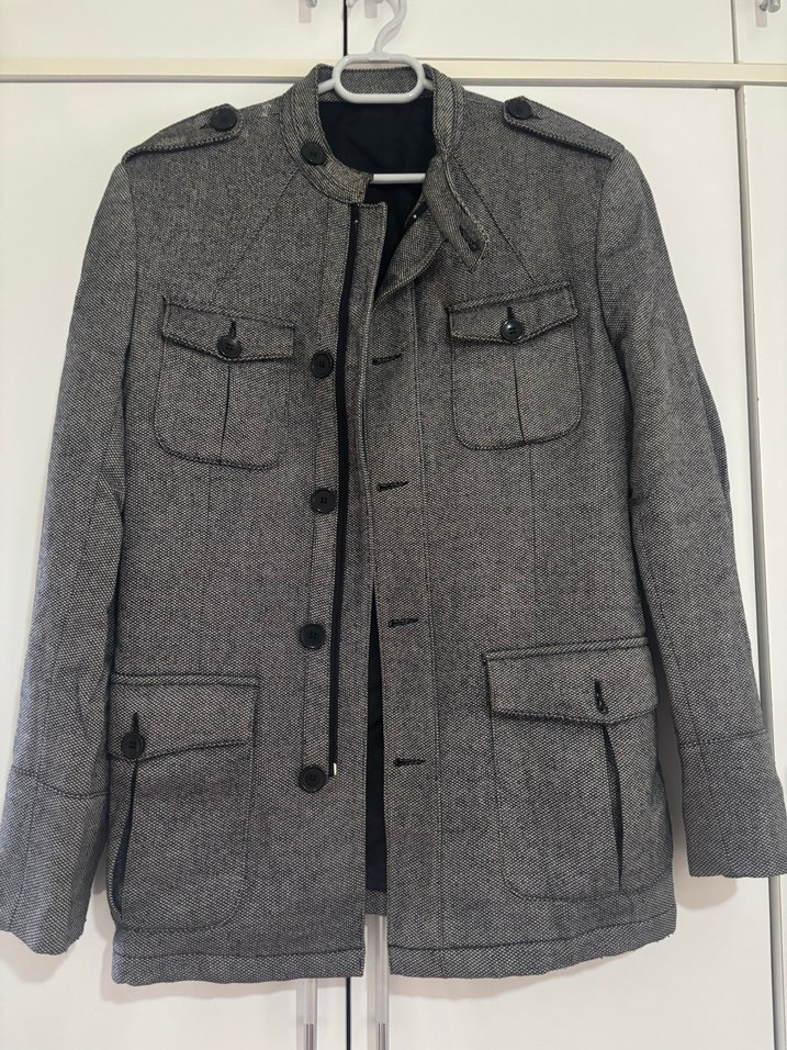 Gri yün ceketin düğmeli ve kesik yaka detayı vardır. Normal kesim, uzun kollu ve çoklu cep tasarımıyla sokak modası ve iş stilini birleştirir. Günlük kullanıma uygundur.