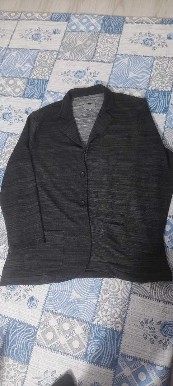 Düğmeli ve sivri yakalı erkek ceket, yumuşak sentetik kumaştan üretilmiştir. Uzun kollu, normal kesim ve gri renktedir. Ofis kullanımı için uygundur.