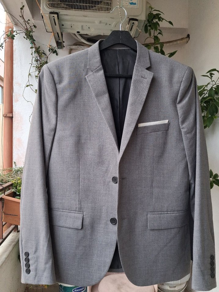 Düğmeli Gri Erkek Ceket, Normal Boy, Notch Yaka