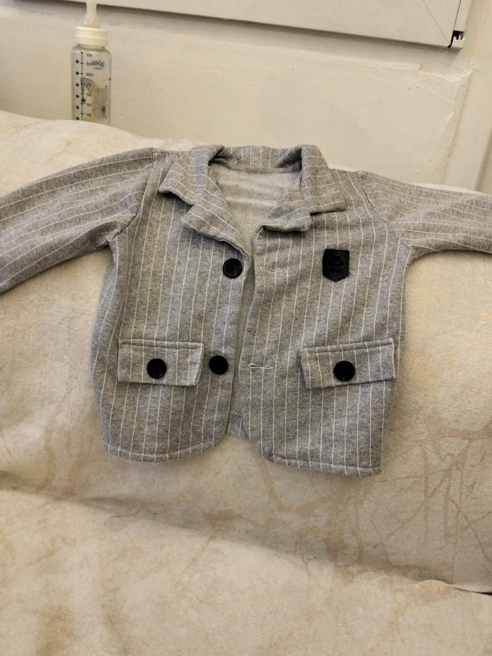 Gri renkte, düğmeli ve kesimli yaka detaylı erkek çocuk ceketi. Rahat kesimi ve sıcak dokusuyla sokak tarzına uygun bir parça. kumaşı ince dir