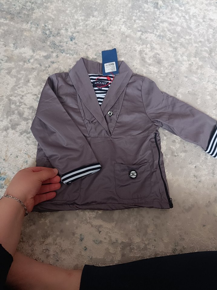 Düğmeli, gri renkli erkek çocuk ceketi. Notlu yakalı, bol kesim ve yumuşak, sıcak kumaştan üretilmiştir. Çizgili manşet detaylıdır.
