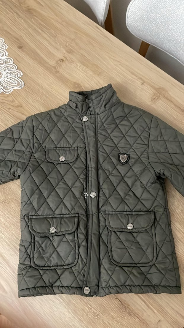Düğmeli önü ve kesilmiş yakasıyla gri renkli, yumuşak kapitone kumaştan yapılmış erkek çocuk kabanı. Çoklu cepleri ve küçük amblemi bulunur. Sokak tarzına uygun.