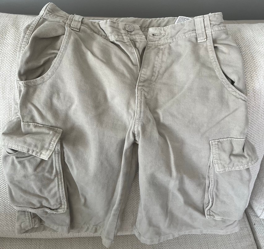 Düğmeli, keten kumaştan yapılmış gri erkek çocuk pantolonu. Salaş kesimli ve düz tasarımlı, sokak stiline uygun.