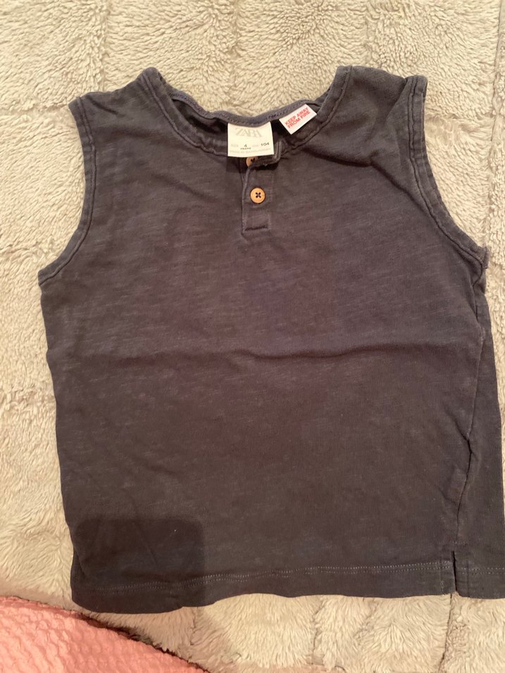 Gri renkli, düğmeli, kolsuz erkek çocuk tişörtü. Pamuk kumaştan, rahat bir kesime sahiptir.
