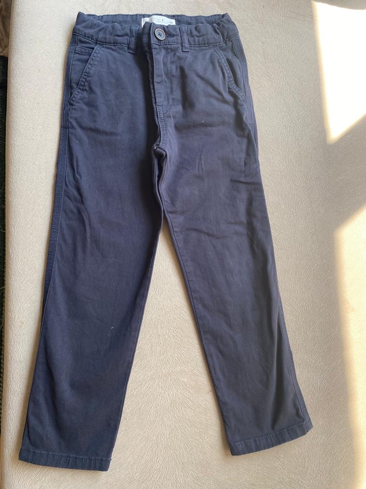 Düğmeli, düz kesim, kot kumaştan yapılmış gri-mavi renk erkek çocuk pantolonu. Rahat ve sade tasarım.