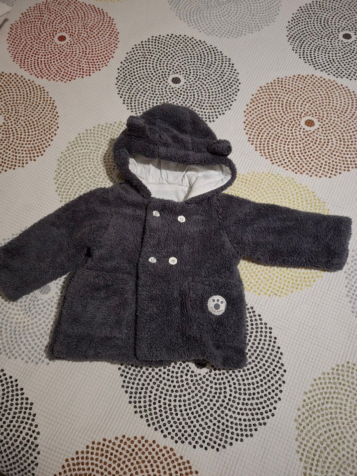 Düğmeli ve işlemeli detaylı, yumuşak kumaştan gri erkek çocuk palto. Kapüşonunda ayı kulakları bulunur, rahat ve şık bir sokak stili sunar.