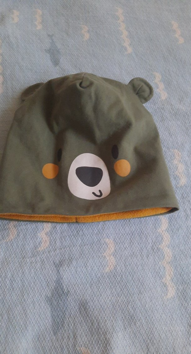 Düğmeli kulak detaylı, ayı yüzü baskılı gri polar bere, erkek çocuklar için yumuşak ve sıcak tutar.