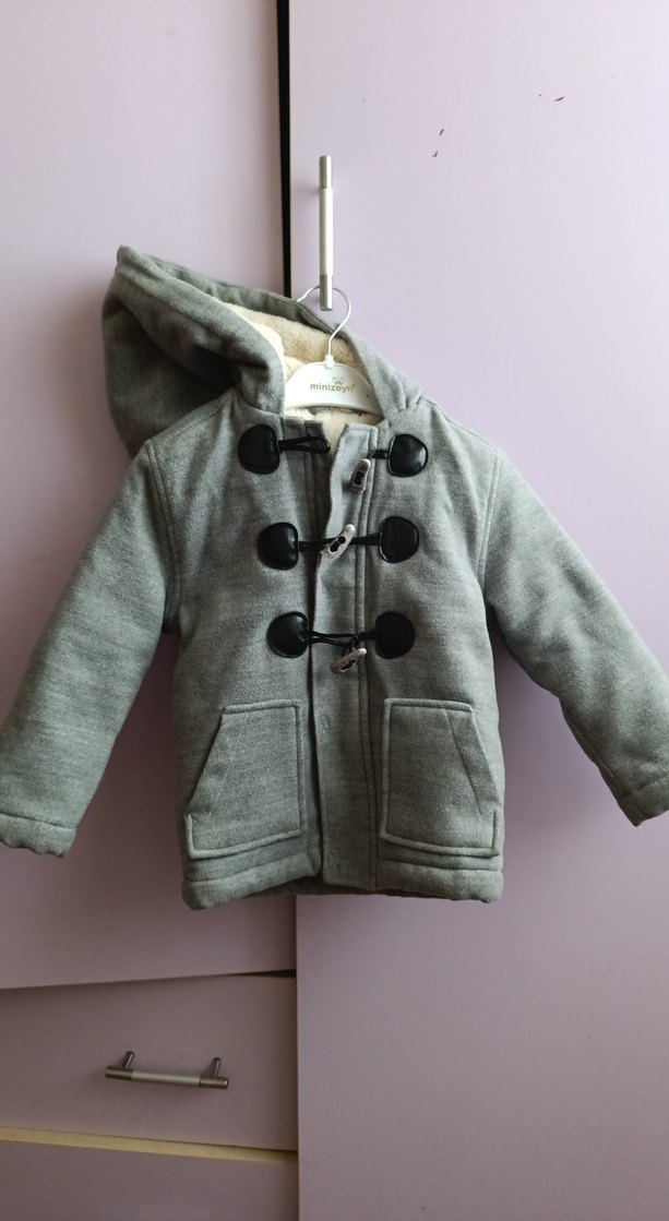 Düğmeli ve kapüşonlu, yumuşak ve sıcak kumaştan yapılmış gri erkek çocuk mont. Notch yaka ve ön cepler içerir.