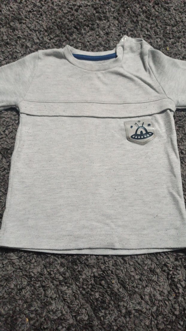 Düğmeli, yuvarlak yaka ve uzun kollu gri erkek çocuk sweatshirtü. Gevşek kesim, küçük uzay gemisi desenli cep ve yumuşak, sıcak kumaş.