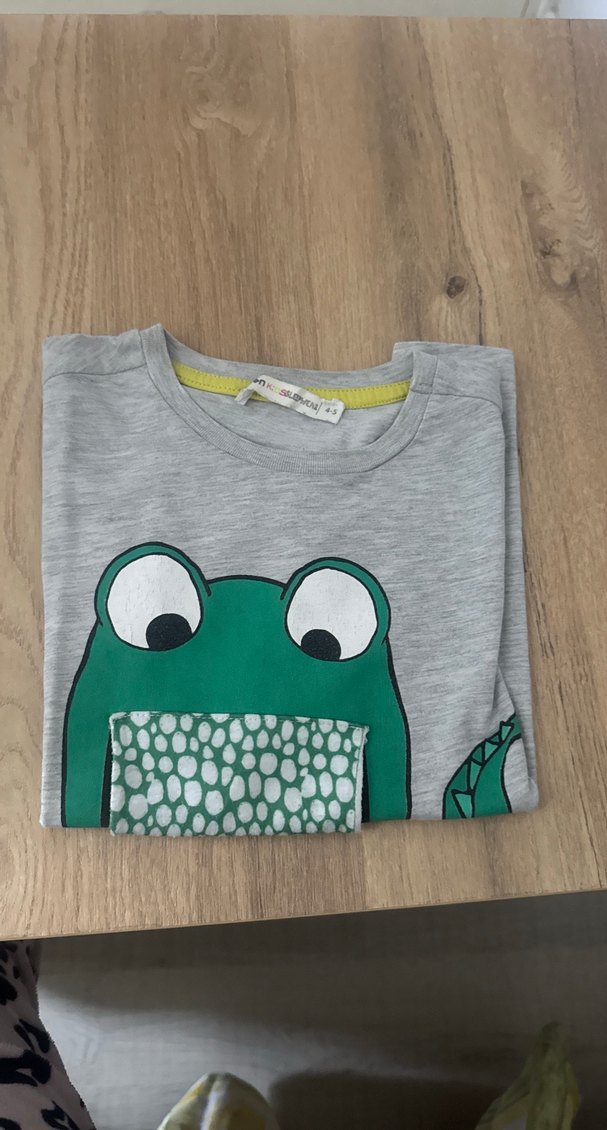 Pamuklu, düğmeli ve baskılı kurbağa desenli gri erkek çocuk tişörtü, kısa kollu ve bol kesimdir. Rahat sokak tarzı için uygundur.