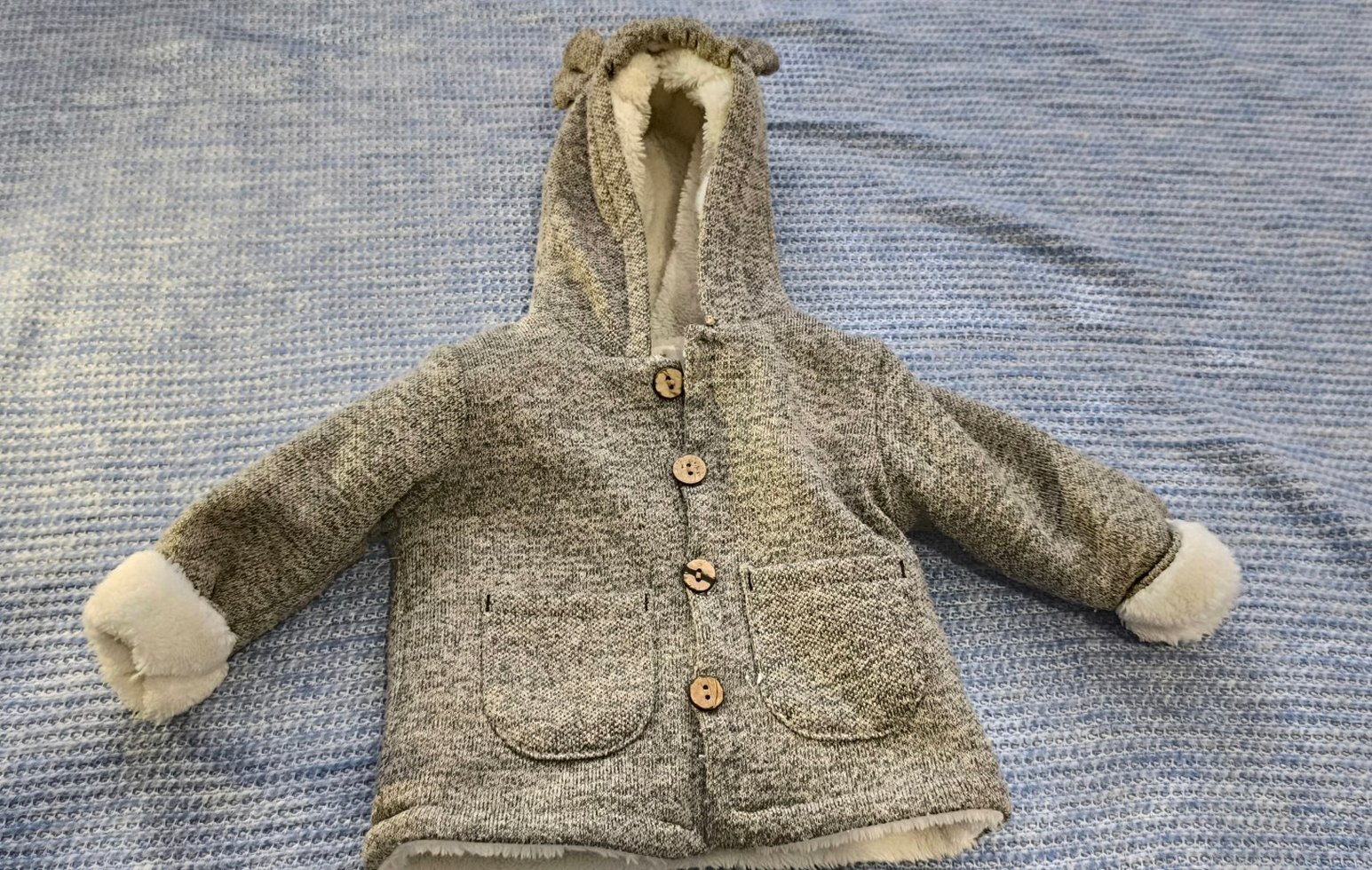Düğmeli, triko kumaştan yapılmış gri renkli, fitted kesim erkek çocuk kabanı. Cepli ve yumuşak astarlı kapüşonlu, sade tasarım. ikinci el deforme vs yoktur 6-9 ay