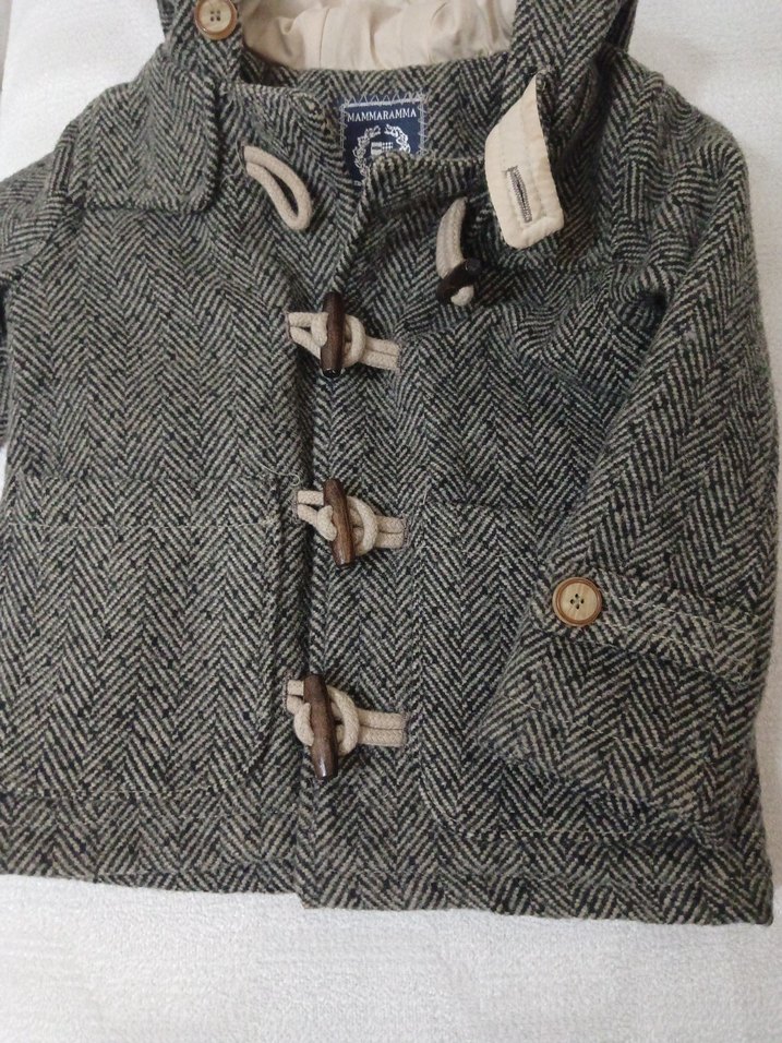 Düğmeli ve yün kumaştan yapılmış, gri renkte, kesimli erkek çocuk kabanı. Notched lapel yakaya ve sokak stili görünümüne sahip.