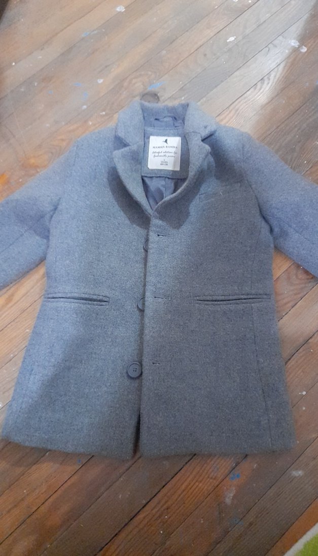 Düğmeli, gri renkli erkek çocuk yün kaban, düz kesim ve kesik yaka detayına sahiptir. Desensiz ve rahat bir tarza uygundur.