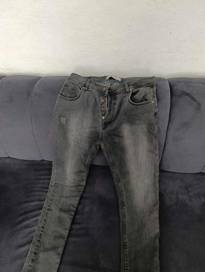 Düğmeli önden kapamalı, gri renkte, normal boyda, dar kesim erkek denim pantolon.