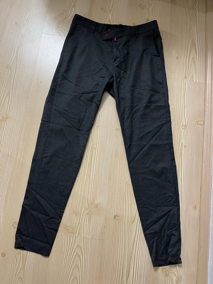 Düğmeli, koyu gri renkte denim erkek pantolon. Normal boy ve midi uzunlukta, rahat kesim, gündelik sokak stili için uygundur.