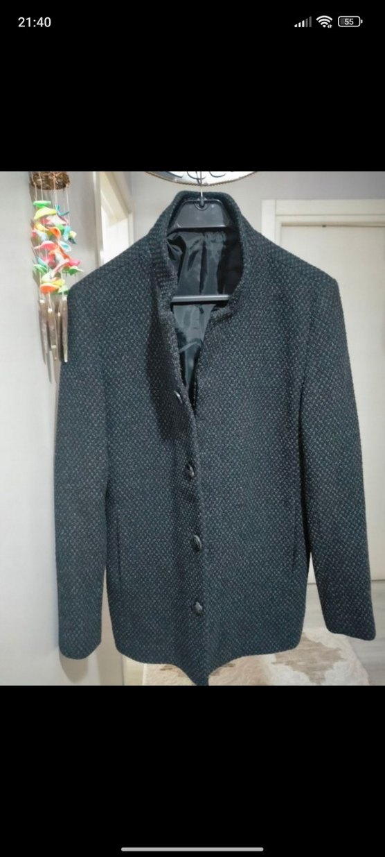 Düğmeli ön kısmı, notched yakası ve uzun kollu gri erkek ceket, sentetik kumaştan midi boy ve regular fit olarak tasarlanmıştır. Günlük ve sokak stiline uygundur.