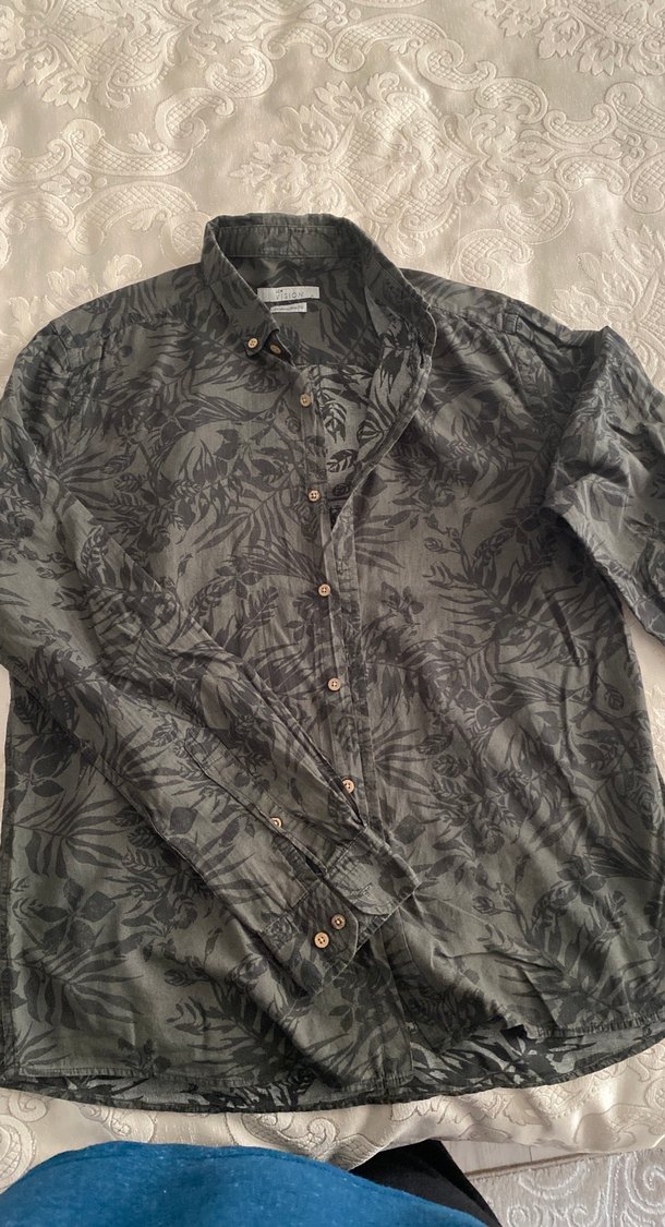 Düğmeli, uzun kollu, yakalı ve bol kesim erkek keten gömlek. Gri renkte, hafif desenli sokak stili. Günlük rahat kullanım için uygundur.