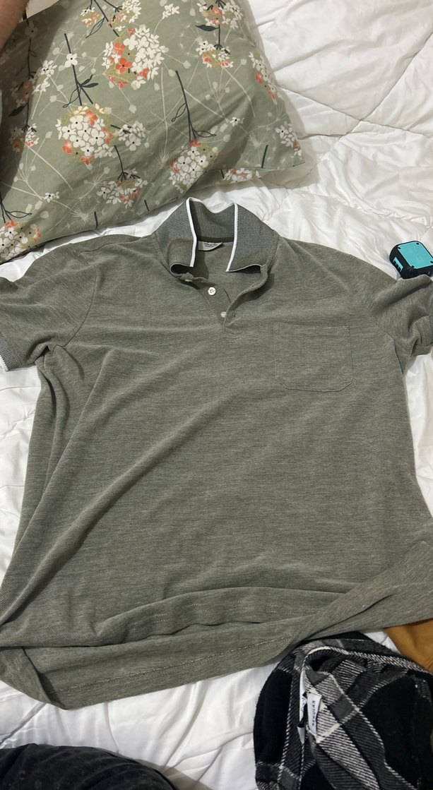 Gri renkli erkek keten polo tişört, düğmeli yakası ve kısa kolludur. Gevşek kesim ve normal boyda, günlük rahat sokak stiline uygundur.