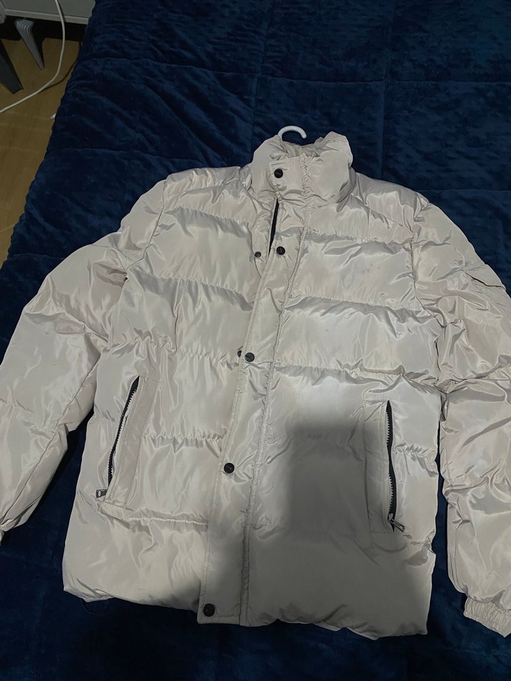 Düğmeli, yakalı beyaz kışlık erkek ceketi, uzun kollu ve midi boyda. Yumuşak ve sıcak kumaştan, rahat dış mekan kullanımı için uygun. ❄️ 1-2 kere kullanıldı sorunsuz