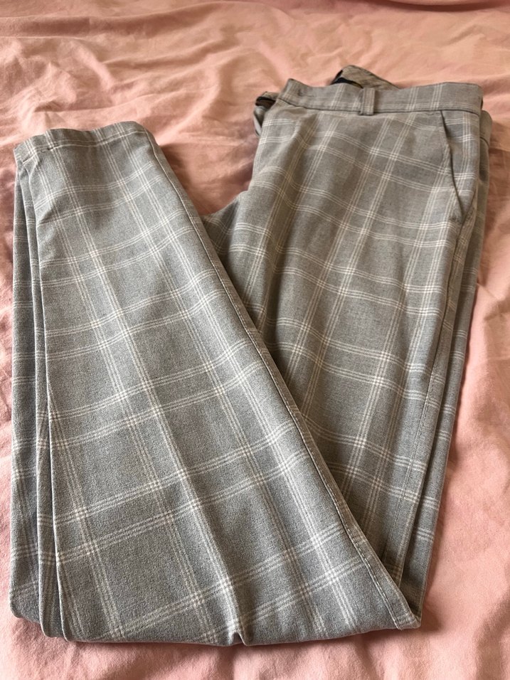 Düğmeli ön kısmı ve ince kare desenli gri erkek kumaş pantolon, ofis için regular fit kesime sahiptir.