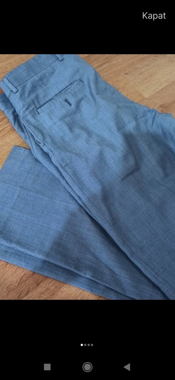 Düğmeli, midi boy, regular kesim erkek kumaş pantolon. Denim kumaştan, gri-mavi tonlarında, ofis için uygun normcore tarzda.