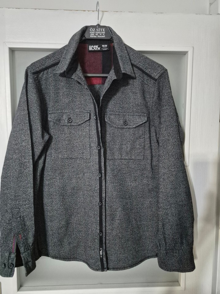 Gri yün erkek gomlek, düğmeli ve notched yaka detaylıdır. Regular kesim, uzun kollu ve midi boyda, günlük sokak stiline uygundur. İki cep içerir. cok kalin degildir.