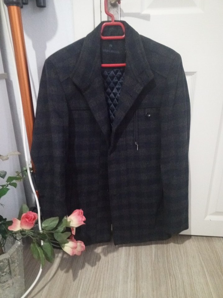 Düğmeli, koyu gri erkek midi ceket, düğmeli ve uzun kolludur. Sentetik kumaştan, günlük sokak tarzına uygun rahat kesimdir.