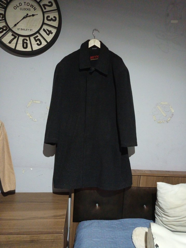Düğmeli, gri renkli erkek kaban; normal midi boy, düğmeli, uzun kollu ve klasik minimal stil ile ofis kullanımı için uygundur. Yumuşak ve sıcak kumaştan üretilmiştir.
